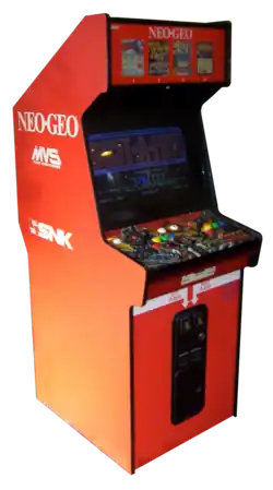 SNK est surtout connue dans les années 1990 pour le Neo-Geo MVS, qui est un système pour borne d'arcade décliné en console de salon haut de gamme, la Neo-Geo AES[83]. Malgré plusieurs tentatives infructueuses, SNK n'a pas réussi à s'imposer sur le marché des consoles de salon, ni sur celui des portables[84].