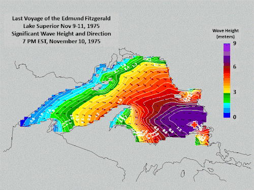 Selon la position finale du Fitzgerald, il coula à l'extrémité Est de la zone de vents forts dans la simulation, là où le fetch, la distance au-dessus du lac où souffle le vent sans rencontrer d'obstacle, était maximal et produisait des vagues ayant en moyenne plus de 7,0 m à 19 h et de plus de 7,6 m à 20 h[87]. La simulation démontra également qu'une vague sur 100 atteignait 11 m et une sur 1000, 14 m. Étant donné que le navire se dirigeait vers l'est-sud-est, ces vagues pouvaient facilement donner un roulis dangereux au Fitzgerald[88].