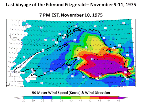 En 2005, le National Weather Service de la NOAA fit une simulation informatique des conditions météorologiques et de houle, pour la période allant du jusqu'au petit matin de , avec toutes les données disponibles et avec le plus récent modèle de prévision numérique du temps et des vagues[84]. L'analyse montra que deux zones distinctes de grands vents apparurent sur le lac Supérieur à 16 h le . Dans la première, la vitesse était supérieure à 43 nœuds (80 km/h) et dans l'autre, il était de plus de 40 nœuds (74 km/h)[85]. Sur la partie sud-est du lac, la direction vers laquelle le Fitzgerald se dirigeait, se retrouvaient les vents les plus forts donnant une hauteur des vagues moyennes de près de 5,8 m. Vers 19 h, les vents dépassaient les 43 nœuds (80 km/h) sur la majeure partie du sud-est du lac Supérieur[86].