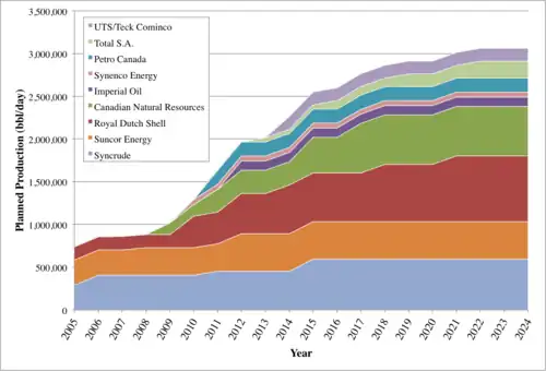 En 2012, la production de bitume brut à partir des sables bitumineux a été en moyenne de 1,9 million de barils par jour (bbl/j), soit un total annuel de 112 000 000 m3. D'abord prévue pour atteindre les 4 millions de barils par jour en 2022[2], elle a connu un ralentissement. Elle dépasse légèrement les trois millions de barils par jour en 2019 et ne devrait atteindre 4 millions de barils par jour qu'en 2030[3].