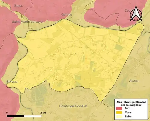 Le retrait-gonflement des sols argileux est susceptible d'engendrer des dommages importants aux bâtiments en cas d’alternance de périodes de sécheresse et de pluie. La totalité de la commune est en aléa moyen ou fort (67,4 % au niveau départemental et 48,5 % au niveau national). Sur les 569 bâtiments dénombrés sur la commune en 2019, 569 sont en aléa moyen ou fort, soit 100 %, à comparer aux 84 % au niveau départemental et 54 % au niveau national. Une cartographie de l'exposition du territoire national au retrait gonflement des sols argileux est disponible sur le site du BRGM[17],[Carte 2].