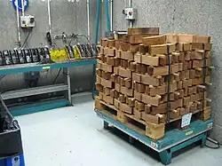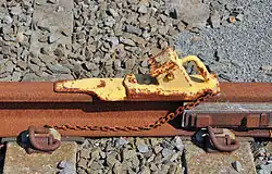 Le sabot (ou taquet) est un morceau de fonte que l'on pose sur le rail. Lorsqu'un wagon arrive, il percute le sabot qui glisse sur le rail, ce qui l'immobilise au bout d'un moment.
