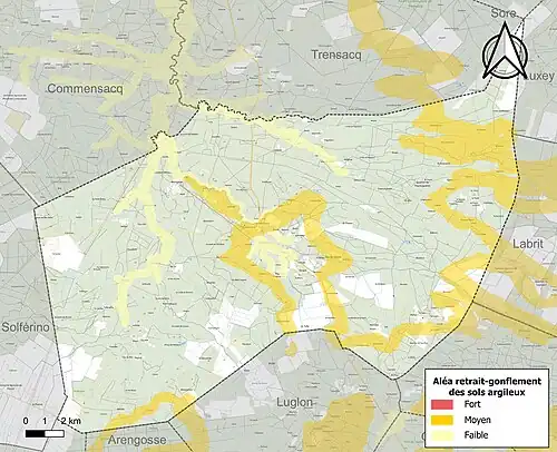 Le retrait-gonflement des sols argileux est susceptible d'engendrer des dommages importants aux bâtiments en cas d’alternance de périodes de sécheresse et de pluie. 16,5 % de la superficie communale est en aléa moyen ou fort (19,2 % au niveau départemental et 48,5 % au niveau national). Sur les 656 bâtiments dénombrés sur la commune en 2019, 158 sont en aléa moyen ou fort, soit 24 %, à comparer aux 17 % au niveau départemental et 54 % au niveau national. Une cartographie de l'exposition du territoire national au retrait gonflement des sols argileux est disponible sur le site du BRGM[20],[Carte 2].