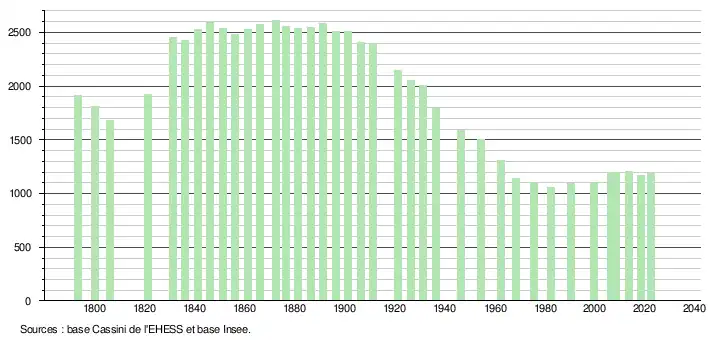 | L'évolution du nombre d'habitants est connue à travers les recensements de la population effectués dans la commune depuis 1793. Pour les communes de moins de 10 000 habitants, une enquête de recensement portant sur toute la population est réalisée tous les cinq ans, les populations de référence des années intermédiaires étant quant à elles estimées par interpolation ou extrapolation[22]. Pour la commune, le premier recensement exhaustif entrant dans le cadre du nouveau dispositif a été réalisé en 2008[23]. En 2022, la commune comptait 1 191 habitants[Note 4], en évolution de +1,1 % par rapport à 2016 (Landes : +5,78 %, France hors Mayotte : +2,11 %). |