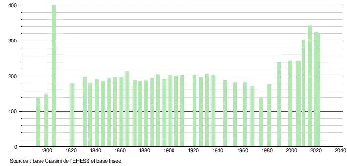 L'évolution du nombre d'habitants est connue à travers les recensements de la population effectués dans la commune depuis 1793. Pour les communes de moins de 10 000 habitants, une enquête de recensement portant sur toute la population est réalisée tous les cinq ans, les populations de référence des années intermédiaires étant quant à elles estimées par interpolation ou extrapolation[32]. Pour la commune, le premier recensement exhaustif entrant dans le cadre du nouveau dispositif a été réalisé en 2005[33].