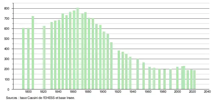 L'évolution du nombre d'habitants est connue à travers les recensements de la population effectués dans la commune depuis 1793. Pour les communes de moins de 10 000 habitants, une enquête de recensement portant sur toute la population est réalisée tous les cinq ans, les populations de référence des années intermédiaires étant quant à elles estimées par interpolation ou extrapolation[23]. Pour la commune, le premier recensement exhaustif entrant dans le cadre du nouveau dispositif a été réalisé en 2008[24].
