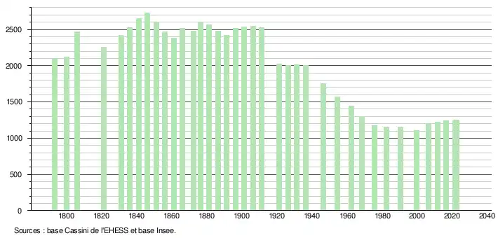 L'évolution du nombre d'habitants est connue à travers les recensements de la population effectués dans la commune depuis 1793. Pour les communes de moins de 10 000 habitants, une enquête de recensement portant sur toute la population est réalisée tous les cinq ans, les populations de référence des années intermédiaires étant quant à elles estimées par interpolation ou extrapolation[19]. Pour la commune, le premier recensement exhaustif entrant dans le cadre du nouveau dispositif a été réalisé en 2006[20].