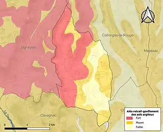 La commune est vulnérable au risque de mouvements de terrains constitué principalement du retrait-gonflement des sols argileux[15]. Cet aléa est susceptible d'engendrer des dommages importants aux bâtiments en cas d’alternance de périodes de sécheresse et de pluie. 80,6 % de la superficie communale est en aléa moyen ou fort (26,8 % au niveau départemental et 48,5 % au niveau national). Sur les 145 bâtiments dénombrés sur la commune en 2019, 126 sont en aléa moyen ou fort, soit 87 %, à comparer aux 36 % au niveau départemental et 54 % au niveau national. Une cartographie de l'exposition du territoire national au retrait gonflement des sols argileux est disponible sur le site du BRGM[16],[Carte 2].