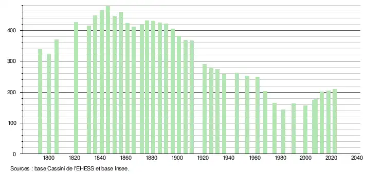 L'évolution du nombre d'habitants est connue à travers les recensements de la population effectués dans la commune depuis 1793. Pour les communes de moins de 10 000 habitants, une enquête de recensement portant sur toute la population est réalisée tous les cinq ans, les populations de référence des années intermédiaires étant quant à elles estimées par interpolation ou extrapolation[18]. Pour la commune, le premier recensement exhaustif entrant dans le cadre du nouveau dispositif a été réalisé en 2007[19].