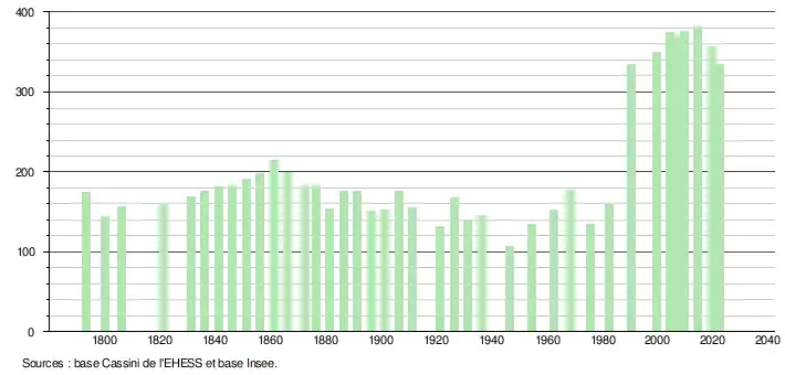 L'évolution du nombre d'habitants est connue à travers les recensements de la population effectués dans la commune depuis 1793. Pour les communes de moins de 10 000 habitants, une enquête de recensement portant sur toute la population est réalisée tous les cinq ans, les populations de référence des années intermédiaires étant quant à elles estimées par interpolation ou extrapolation[19]. Pour la commune, le premier recensement exhaustif entrant dans le cadre du nouveau dispositif a été réalisé en 2004[20].
