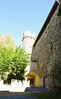 De l’époque médiévale, le château ne conserve plus que l’enceinte fortifiée polygonale construite avec des moellons de basalte, prélevés sur place ou à proximité. Les bâtiments sont organisés autour d’une cour centrale où se trouve le puits. Ils ont été presque entièrement reconstruits au XVe siècle. On doit à Guillaume d’Albon (1415-1456) la construction de la tour de Montbloy ou tour de l’Horloge et la restructuration de l’aile orientale. Les corps de logis en sont desservis par un escalier à vis logé dans une tourelle hors-œuvre. Son successeur, Jean d’Albon (1456-1492) a créé la grande galerie sur cour du bâtiment méridional et a aménagé la chapelle. On lui doit aussi la tour du Colombier à vocation défensive. À partir du XVe siècle cette aile sud semble devenir le bâtiment le plus important du château. Elle abritait au XVIIe siècle le tribunal et les appartements de l’abbé. Elle est flanquée de deux tours carrées : la tour de la porte ou petite tour à l’est et la tour des Empereurs qui devait son nom aux portraits d’empereurs romains peints sur les murs d’une de ses pièces. Cette porte a été détruite au XIXe siècle mais il subsiste quelques vestiges de sa partie basse dans la maison construite sur son emplacement après un incendie au XIXe siècle[32].