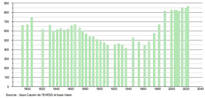 L'évolution du nombre d'habitants est connue à travers les recensements de la population effectués dans la commune depuis 1793. Pour les communes de moins de 10 000 habitants, une enquête de recensement portant sur toute la population est réalisée tous les cinq ans, les populations de référence des années intermédiaires étant quant à elles estimées par interpolation ou extrapolation[20]. Pour la commune, le premier recensement exhaustif entrant dans le cadre du nouveau dispositif a été réalisé en 2004[21].