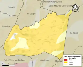 La commune est vulnérable au risque de mouvements de terrains constitué principalement du retrait-gonflement des sols argileux[15]. Cet aléa est susceptible d'engendrer des dommages importants aux bâtiments en cas d’alternance de périodes de sécheresse et de pluie. 84,8 % de la superficie communale est en aléa moyen ou fort (52,8 % au niveau départemental et 48,5 % au niveau national). Sur les 476 bâtiments dénombrés sur la commune en 2019, 423 sont en aléa moyen ou fort, soit 89 %, à comparer aux 70 % au niveau départemental et 54 % au niveau national. Une cartographie de l'exposition du territoire national au retrait gonflement des sols argileux est disponible sur le site du BRGM[16],[17].