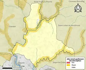 La commune est vulnérable au risque de mouvements de terrains constitué principalement du retrait-gonflement des sols argileux[17]. Cet aléa est susceptible d'engendrer des dommages importants aux bâtiments en cas d’alternance de périodes de sécheresse et de pluie. 22,1 % de la superficie communale est en aléa moyen ou fort (26,8 % au niveau départemental et 48,5 % au niveau national). Sur les 83 bâtiments dénombrés sur la commune en 2019, quatre sont en aléa moyen ou fort, soit 5 %, à comparer aux 36 % au niveau départemental et 54 % au niveau national. Une cartographie de l'exposition du territoire national au retrait gonflement des sols argileux est disponible sur le site du BRGM[18],[Carte 2].