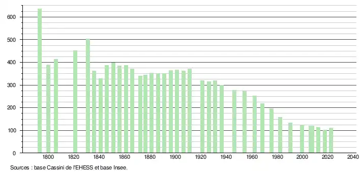 L'évolution du nombre d'habitants est connue à travers les recensements de la population effectués dans la commune depuis 1793. Pour les communes de moins de 10 000 habitants, une enquête de recensement portant sur toute la population est réalisée tous les cinq ans, les populations de référence des années intermédiaires étant quant à elles estimées par interpolation ou extrapolation[23]. Pour la commune, le premier recensement exhaustif entrant dans le cadre du nouveau dispositif a été réalisé en 2007[24].