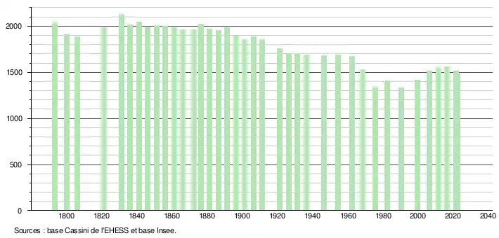 L'évolution du nombre d'habitants est connue à travers les recensements de la population effectués dans la commune depuis 1793. Pour les communes de moins de 10 000 habitants, une enquête de recensement portant sur toute la population est réalisée tous les cinq ans, les populations de référence des années intermédiaires étant quant à elles estimées par interpolation ou extrapolation[23]. Pour la commune, le premier recensement exhaustif entrant dans le cadre du nouveau dispositif a été réalisé en 2006[24].