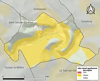 La commune est vulnérable au risque de mouvements de terrains constitué principalement du retrait-gonflement des sols argileux[21]. Cet aléa est susceptible d'engendrer des dommages importants aux bâtiments en cas d’alternance de périodes de sécheresse et de pluie. 68,3 % de la superficie communale est en aléa moyen ou fort (59,3 % au niveau départemental et 48,5 % au niveau national). Sur les 159 bâtiments dénombrés sur la commune en 2019, 158 sont en aléa moyen ou fort, soit 99 %, à comparer aux 85 % au niveau départemental et 54 % au niveau national. Une cartographie de l'exposition du territoire national au retrait gonflement des sols argileux est disponible sur le site du BRGM[22],[Carte 2].