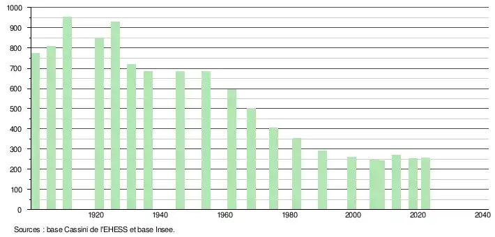 L'évolution du nombre d'habitants est connue à travers les recensements de la population effectués dans la commune depuis 1901. Pour les communes de moins de 10 000 habitants, une enquête de recensement portant sur toute la population est réalisée tous les cinq ans, les populations de référence des années intermédiaires étant quant à elles estimées par interpolation ou extrapolation[30]. Pour la commune, le premier recensement exhaustif entrant dans le cadre du nouveau dispositif a été réalisé en 2008[31].