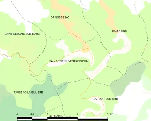 - ↑ « Orthodromie entre Saint-Étienne-Estréchoux et Bédarieux », sur fr.distance.to (consulté le ).