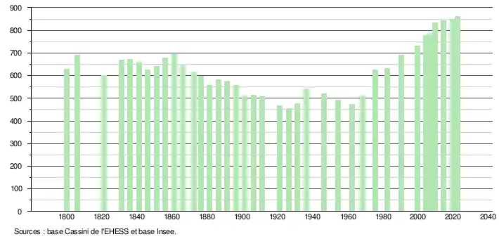 L'évolution du nombre d'habitants est connue à travers les recensements de la population effectués dans la commune depuis 1800. Pour les communes de moins de 10 000 habitants, une enquête de recensement portant sur toute la population est réalisée tous les cinq ans, les populations de référence des années intermédiaires étant quant à elles estimées par interpolation ou extrapolation[23]. Pour la commune, le premier recensement exhaustif entrant dans le cadre du nouveau dispositif a été réalisé en 2004[24].