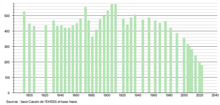 L'évolution du nombre d'habitants est connue à travers les recensements de la population effectués dans la commune depuis 1793. Pour les communes de moins de 10 000 habitants, une enquête de recensement portant sur toute la population est réalisée tous les cinq ans, les populations de référence des années intermédiaires étant quant à elles estimées par interpolation ou extrapolation[18]. Pour la commune, le premier recensement exhaustif entrant dans le cadre du nouveau dispositif a été réalisé en 2004[19].