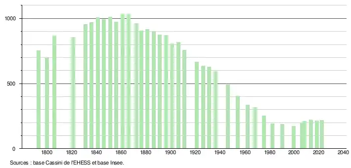 L'évolution du nombre d'habitants est connue à travers les recensements de la population effectués dans la commune depuis 1793. Pour les communes de moins de 10 000 habitants, une enquête de recensement portant sur toute la population est réalisée tous les cinq ans, les populations de référence des années intermédiaires étant quant à elles estimées par interpolation ou extrapolation[15]. Pour la commune, le premier recensement exhaustif entrant dans le cadre du nouveau dispositif a été réalisé en 2008[16].