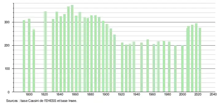 L'évolution du nombre d'habitants est connue à travers les recensements de la population effectués dans la commune depuis 1793. Pour les communes de moins de 10 000 habitants, une enquête de recensement portant sur toute la population est réalisée tous les cinq ans, les populations de référence des années intermédiaires étant quant à elles estimées par interpolation ou extrapolation[23]. Pour la commune, le premier recensement exhaustif entrant dans le cadre du nouveau dispositif a été réalisé en 2007[24].