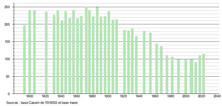 ). - ↑ Population municipale de référence en vigueur au 1er janvier 2025, millésimée 2022, définie dans les limites territoriales en vigueur au 1er janvier 2024, date de référence statistique : 1er janvier 2022.