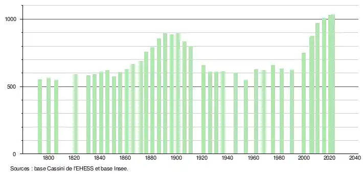 L'évolution du nombre d'habitants est connue à travers les recensements de la population effectués dans la commune depuis 1793. Pour les communes de moins de 10 000 habitants, une enquête de recensement portant sur toute la population est réalisée tous les cinq ans, les populations de référence des années intermédiaires étant quant à elles estimées par interpolation ou extrapolation[14]. Pour la commune, le premier recensement exhaustif entrant dans le cadre du nouveau dispositif a été réalisé en 2005[15].