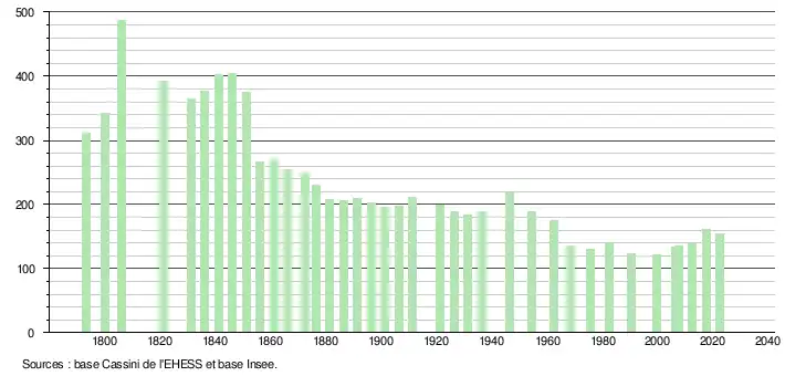 L'évolution du nombre d'habitants est connue à travers les recensements de la population effectués dans la commune depuis 1793. Pour les communes de moins de 10 000 habitants, une enquête de recensement portant sur toute la population est réalisée tous les cinq ans, les populations de référence des années intermédiaires étant quant à elles estimées par interpolation ou extrapolation[21]. Pour la commune, le premier recensement exhaustif entrant dans le cadre du nouveau dispositif a été réalisé en 2007[22].