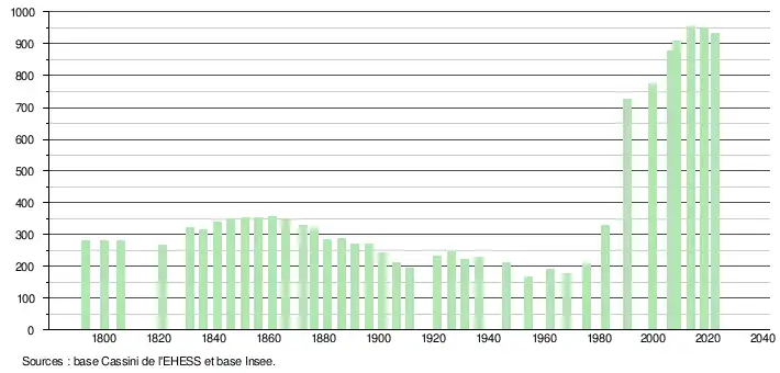 L'évolution du nombre d'habitants est connue à travers les recensements de la population effectués dans la commune depuis 1793. Pour les communes de moins de 10 000 habitants, une enquête de recensement portant sur toute la population est réalisée tous les cinq ans, les populations de référence des années intermédiaires étant quant à elles estimées par interpolation ou extrapolation[13]. Pour la commune, le premier recensement exhaustif entrant dans le cadre du nouveau dispositif a été réalisé en 2008[14].