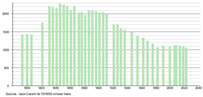 L'évolution du nombre d'habitants est connue à travers les recensements de la population effectués dans la commune depuis 1793. Pour les communes de moins de 10 000 habitants, une enquête de recensement portant sur toute la population est réalisée tous les cinq ans, les populations de référence des années intermédiaires étant quant à elles estimées par interpolation ou extrapolation[27]. Pour la commune, le premier recensement exhaustif entrant dans le cadre du nouveau dispositif a été réalisé en 2008[28].