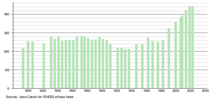 - ↑ Population municipale de référence en vigueur au 1er janvier 2025, millésimée 2022, définie dans les limites territoriales en vigueur au 1er janvier 2024, date de référence statistique : 1er janvier 2022.