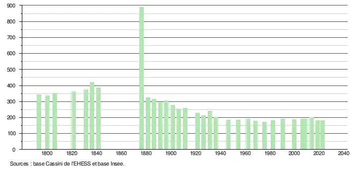 L'évolution du nombre d'habitants est connue à travers les recensements de la population effectués dans la commune depuis 1793. Pour les communes de moins de 10 000 habitants, une enquête de recensement portant sur toute la population est réalisée tous les cinq ans, les populations de référence des années intermédiaires étant quant à elles estimées par interpolation ou extrapolation[18]. Pour la commune, le premier recensement exhaustif entrant dans le cadre du nouveau dispositif a été réalisé en 2008[19].