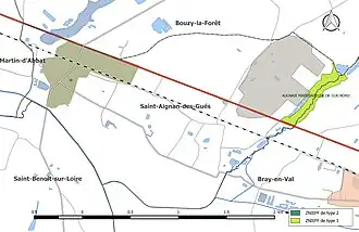 L’inventaire des zones naturelles d'intérêt écologique, faunistique et floristique (ZNIEFF) a pour objectif de réaliser une couverture des zones les plus intéressantes sur le plan écologique, essentiellement dans la perspective d’améliorer la connaissance du patrimoine naturel national et de fournir aux différents décideurs un outil d’aide à la prise en compte de l’environnement dans l’aménagement du territoire. Le territoire communal de Saint-Aignan-des-Gués comprend une ZNIEFF de type 1[Note 1] dénommée « Aulnaie marécageuse de Gué-bord »[INPN 1]. D'une superficie de 9 hectares, elle se localise entre la RD 95 et le hameau de Gué-Bord, au sud-est du bourg de Bouzy-la-Forêt, à 1,5 km de Bray-en-Val[DREAL 1]. Son altitude varie entre 115 et 120 m[INPN 2]. Il s'agit d'une aulnaie tourbeuse de fond de vallée (lit majeur du ruisseau de Saint-Laurent) en très bon état de conservation qui abrite une importante population d'Osmonde royale. Au sein de cette aulnaie, on observe un certain nombre de sources à Chrysosplenium oppositifolium (en population particulièrement importante)[INPN 3].
