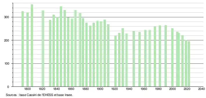 L'évolution du nombre d'habitants est connue à travers les recensements de la population effectués dans la commune depuis 1793. Pour les communes de moins de 10 000 habitants, une enquête de recensement portant sur toute la population est réalisée tous les cinq ans, les populations de référence des années intermédiaires étant quant à elles estimées par interpolation ou extrapolation[21]. Pour la commune, le premier recensement exhaustif entrant dans le cadre du nouveau dispositif a été réalisé en 2008[22].