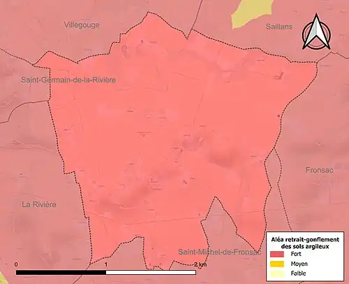Le retrait-gonflement des sols argileux est susceptible d'engendrer des dommages importants aux bâtiments en cas d’alternance de périodes de sécheresse et de pluie. La totalité de la commune est en aléa moyen ou fort (67,4 % au niveau départemental et 48,5 % au niveau national). Sur les 108 bâtiments dénombrés sur la commune en 2019, 108 sont en aléa moyen ou fort, soit 100 %, à comparer aux 84 % au niveau départemental et 54 % au niveau national. Une cartographie de l'exposition du territoire national au retrait gonflement des sols argileux est disponible sur le site du BRGM[18],[Carte 2].