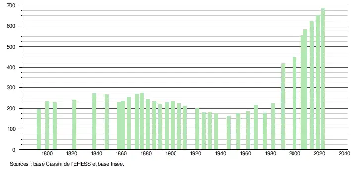 L'évolution du nombre d'habitants est connue à travers les recensements de la population effectués dans la commune depuis 1793. Pour les communes de moins de 10 000 habitants, une enquête de recensement portant sur toute la population est réalisée tous les cinq ans, les populations de référence des années intermédiaires étant quant à elles estimées par interpolation ou extrapolation[9]. Pour la commune, le premier recensement exhaustif entrant dans le cadre du nouveau dispositif a été réalisé en 2008[10].