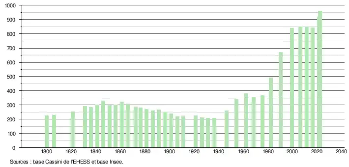 L'évolution du nombre d'habitants est connue à travers les recensements de la population effectués dans la commune depuis 1800. Pour les communes de moins de 10 000 habitants, une enquête de recensement portant sur toute la population est réalisée tous les cinq ans, les populations de référence des années intermédiaires étant quant à elles estimées par interpolation ou extrapolation[17]. Pour la commune, le premier recensement exhaustif entrant dans le cadre du nouveau dispositif a été réalisé en 2006[18].
