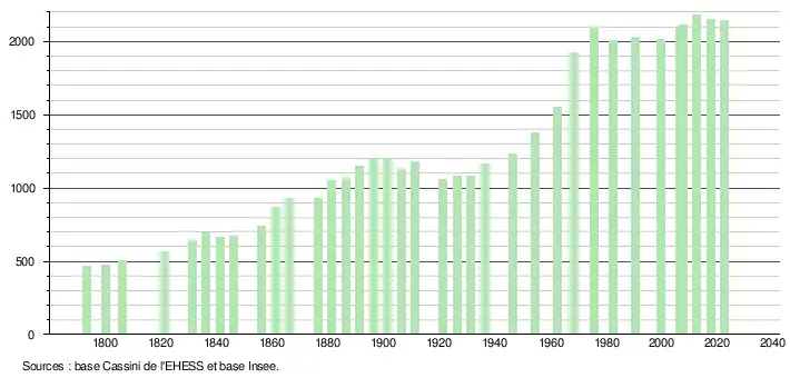L'évolution du nombre d'habitants est connue à travers les recensements de la population effectués dans la commune depuis 1793. Pour les communes de moins de 10000habitants, une enquête de recensement portant sur toute la population est réalisée tous les cinqans, les populations de référence des années intermédiaires étant quant à elles estimées par interpolation ou extrapolation[38]. Pour la commune, le premier recensement exhaustif entrant dans le cadre du nouveau dispositif a été réalisé en 2007[39].