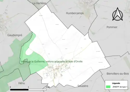 Le territoire communal comprend une ZNIEFF de type 1[Note 3] : la vallée de la Quillienne, ses vallons adjacents et bois d'Orville, d’une superficie de 2 143 ha et d'une altitude variant de 65 à 154 mètres. Cette vallée associe des influences thermophiles dans les lisières et sur les pelouses et un caractère psychrophile au niveau des forêts de ravins. Une partie du site est occupée par l’agriculture intensive[14].
