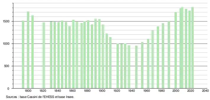 L'évolution du nombre d'habitants est connue à travers les recensements de la population effectués dans la commune depuis 1793. Pour les communes de moins de 10 000 habitants, une enquête de recensement portant sur toute la population est réalisée tous les cinq ans, les populations de référence des années intermédiaires étant quant à elles estimées par interpolation ou extrapolation[28]. Pour la commune, le premier recensement exhaustif entrant dans le cadre du nouveau dispositif a été réalisé en 2008[29].