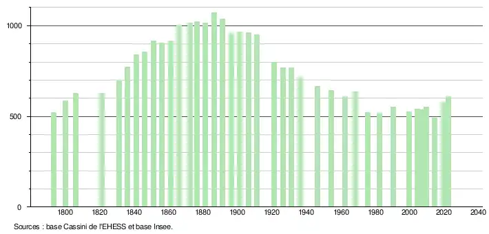 L'évolution du nombre d'habitants est connue à travers les recensements de la population effectués dans la commune depuis 1793. Pour les communes de moins de 10 000 habitants, une enquête de recensement portant sur toute la population est réalisée tous les cinq ans, les populations de référence des années intermédiaires étant quant à elles estimées par interpolation ou extrapolation[17]. Pour la commune, le premier recensement exhaustif entrant dans le cadre du nouveau dispositif a été réalisé en 2004[18].