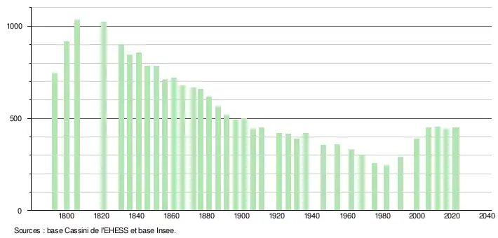 L'évolution du nombre d'habitants est connue à travers les recensements de la population effectués dans la commune depuis 1793. Pour les communes de moins de 10 000 habitants, une enquête de recensement portant sur toute la population est réalisée tous les cinq ans, les populations de référence des années intermédiaires étant quant à elles estimées par interpolation ou extrapolation[29]. Pour la commune, le premier recensement exhaustif entrant dans le cadre du nouveau dispositif a été réalisé en 2006[30].