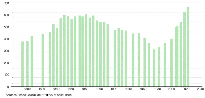 L'évolution du nombre d'habitants est connue à travers les recensements de la population effectués dans la commune depuis 1793. Pour les communes de moins de 10 000 habitants, une enquête de recensement portant sur toute la population est réalisée tous les cinq ans, les populations de référence des années intermédiaires étant quant à elles estimées par interpolation ou extrapolation[17]. Pour la commune, le premier recensement exhaustif entrant dans le cadre du nouveau dispositif a été réalisé en 2007[18].