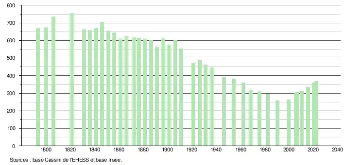 L'évolution du nombre d'habitants est connue à travers les recensements de la population effectués dans la commune depuis 1793. Pour les communes de moins de 10 000 habitants, une enquête de recensement portant sur toute la population est réalisée tous les cinq ans, les populations de référence des années intermédiaires étant quant à elles estimées par interpolation ou extrapolation[33]. Pour la commune, le premier recensement exhaustif entrant dans le cadre du nouveau dispositif a été réalisé en 2005[34].