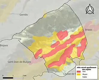 La commune est vulnérable au risque de mouvements de terrains constitué principalement du retrait-gonflement des sols argileux[21]. Cet aléa est susceptible d'engendrer des dommages importants aux bâtiments en cas d’alternance de périodes de sécheresse et de pluie. 49,7 % de la superficie communale est en aléa moyen ou fort (59,3 % au niveau départemental et 48,5 % au niveau national). Sur les 57 bâtiments dénombrés sur la commune en 2019, 46 sont en aléa moyen ou fort, soit 81 %, à comparer aux 85 % au niveau départemental et 54 % au niveau national. Une cartographie de l'exposition du territoire national au retrait gonflement des sols argileux est disponible sur le site du BRGM[22],[Carte 2].