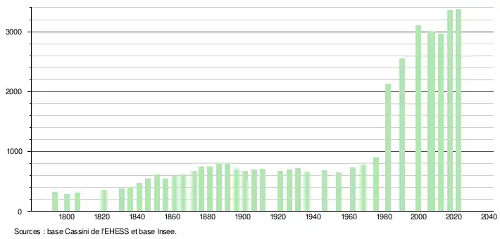 L'évolution du nombre d'habitants est connue à travers les recensements de la population effectués dans la commune depuis 1793. Pour les communes de moins de 10 000 habitants, une enquête de recensement portant sur toute la population est réalisée tous les cinq ans, les populations de référence des années intermédiaires étant quant à elles estimées par interpolation ou extrapolation[22]. Pour la commune, le premier recensement exhaustif entrant dans le cadre du nouveau dispositif a été réalisé en 2007[23].