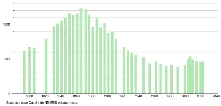 L'évolution du nombre d'habitants est connue à travers les recensements de la population effectués dans la commune depuis 1793. Pour les communes de moins de 10 000 habitants, une enquête de recensement portant sur toute la population est réalisée tous les cinq ans, les populations de référence des années intermédiaires étant quant à elles estimées par interpolation ou extrapolation[16]. Pour la commune, le premier recensement exhaustif entrant dans le cadre du nouveau dispositif a été réalisé en 2004[17].