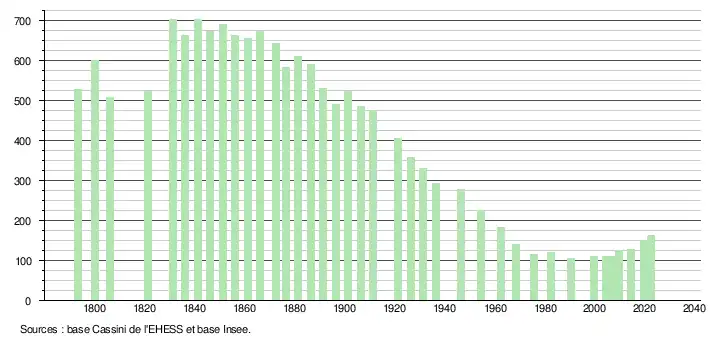 | L'évolution du nombre d'habitants est connue à travers les recensements de la population effectués dans la commune depuis 1793. Pour les communes de moins de 10 000 habitants, une enquête de recensement portant sur toute la population est réalisée tous les cinq ans, les populations de référence des années intermédiaires étant quant à elles estimées par interpolation ou extrapolation[41]. Pour la commune, le premier recensement exhaustif entrant dans le cadre du nouveau dispositif a été réalisé en 2004[42]. En 2022, la commune comptait 163 habitants[Note 5], en évolution de +29,37 % par rapport à 2016 (Lozère : +0,11 %, France hors Mayotte : +2,11 %). |